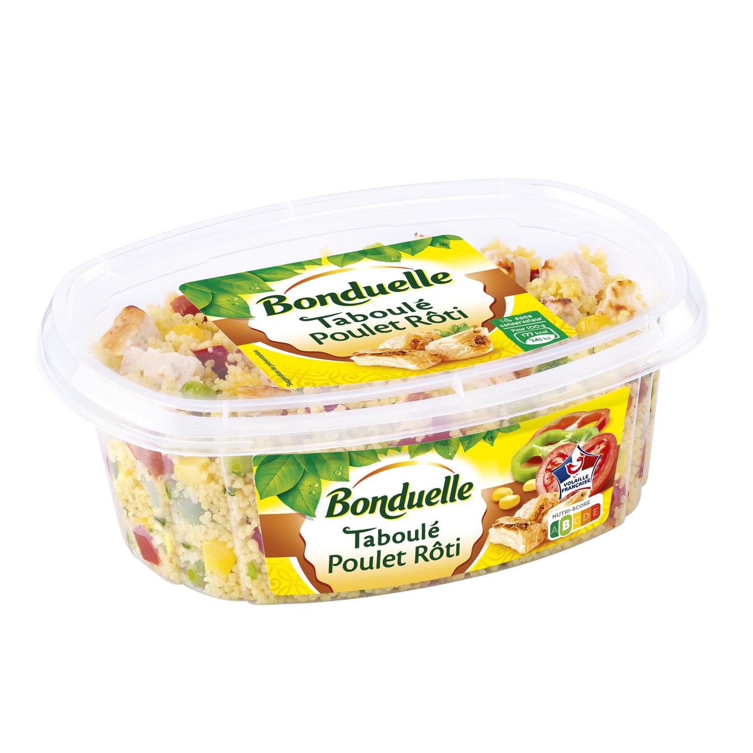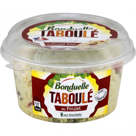 Taboulé au filet de poulet traité en salaison cuit rôti. Ingrédients : Semoule de _blé_ dur réhydraté (57 %), filet de poulet traité en salaison...