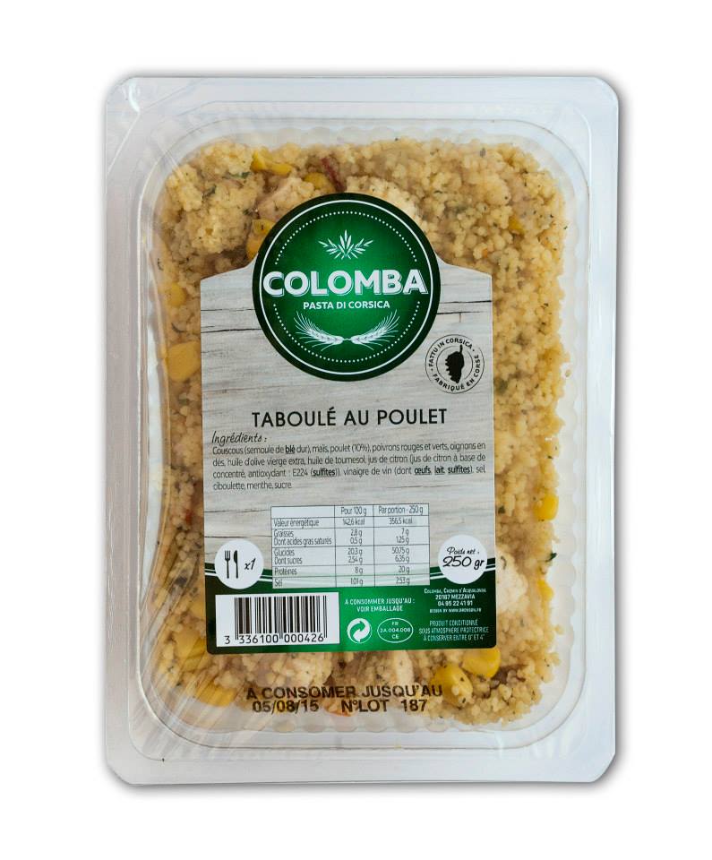Taboule au poulet. Ingrédients : COLOMBA PASTA Dl CORSICA • CORSIC< TABOULÉ AU POULET hgrédien{d: Couscous (semoule de dur) maïs poulet (10%), poivrons rouges et...