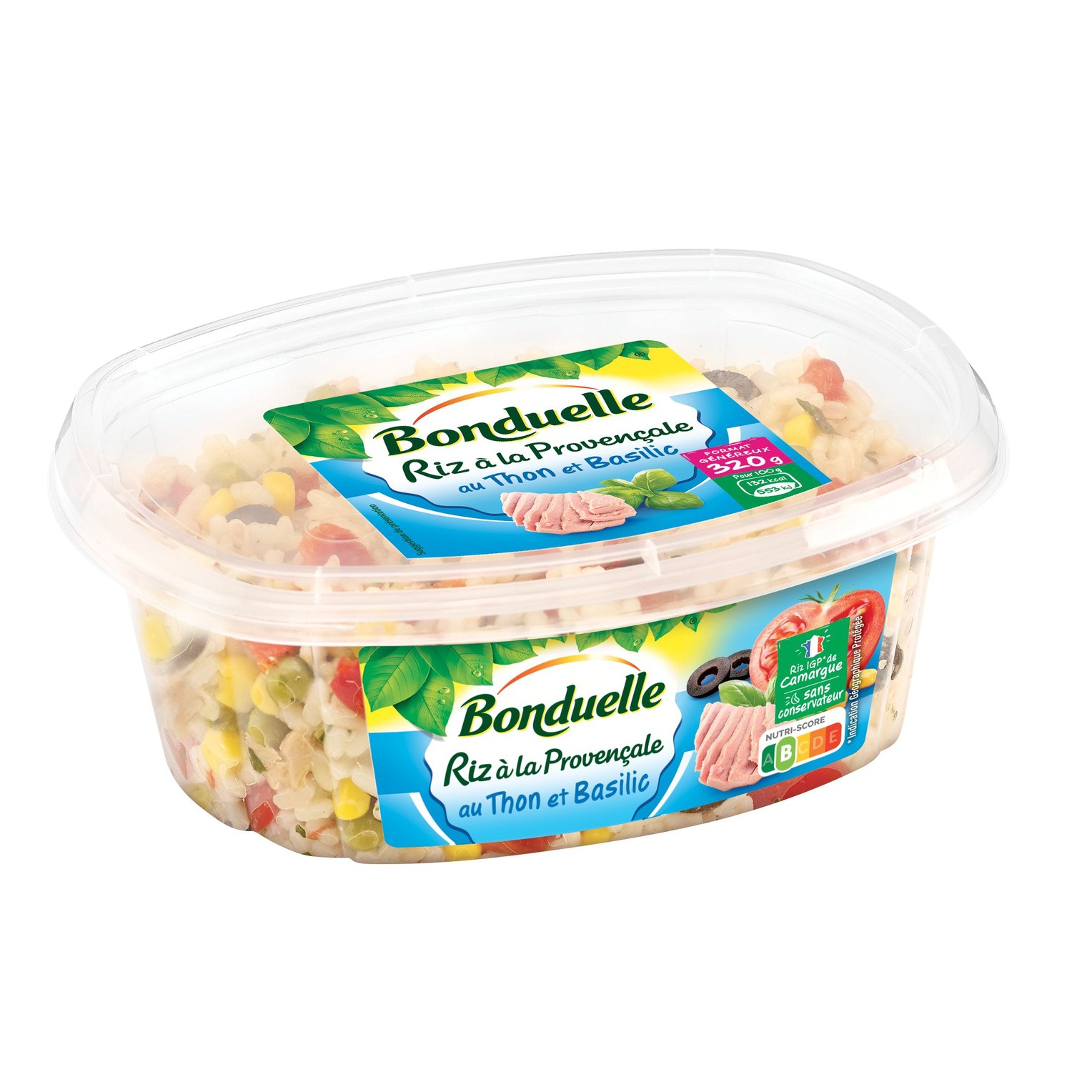 Salade de riz, tomate, thon et basilic assaisonnée. Ingrédients : Riz (52%), tomates (10%), thon (7%), petits pois (4%), olives noires (4% , maïs doux...