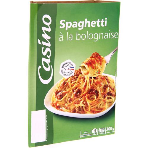 Plat préparé à base de pâtes cuites, de sauce à la tomate et viande de bœuf.. Ingrédients : Eau - pâtes alimentaires spaghetti cuites 26%...