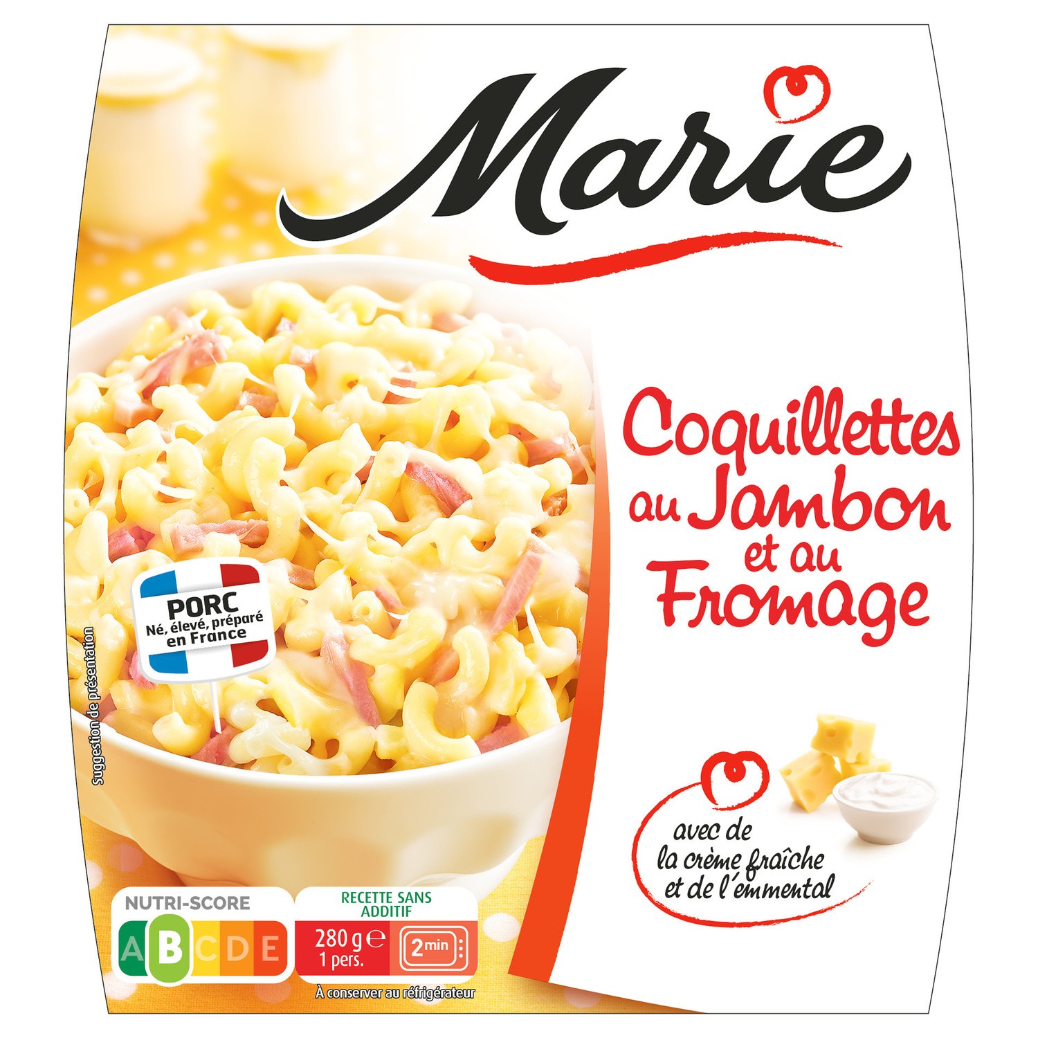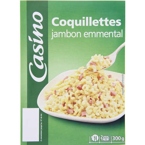 Plat préparé à base de pâtes fraîches cuites, de jambon cuit supérieur fumé et emmental.. Ingrédients : Eau - pâtes fraîches coquillettes cuites 36% (semoule...