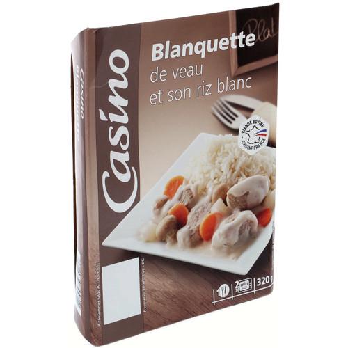 Riz cuit et sauté de viande de veau saumuré (28%) en sauce (20%) avec des champignons de Paris, des carottes et des oignons grelots. Ingrédients...