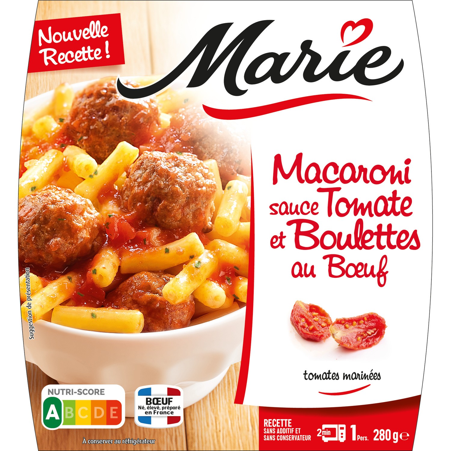 Macaroni sauce Tomate et Boulettes au boeuf. Ingrédients : macaroni cuits 51% (eau , semoule de blé dur, huile de colza), tomates 21,3% (tomates pelées...