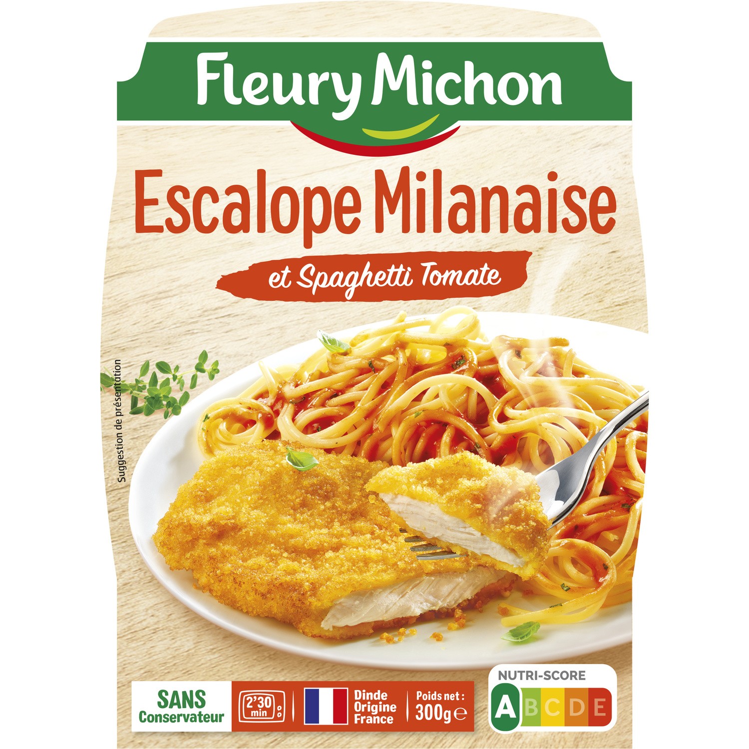 Pâtes (spaghetti), escalope de dinde milanaise à la tomate et basilic. Ingrédients : Pâtes spaghetti 31% (eau, semoule de _blé_ dur), escalope de dinde reconstituée traitée...