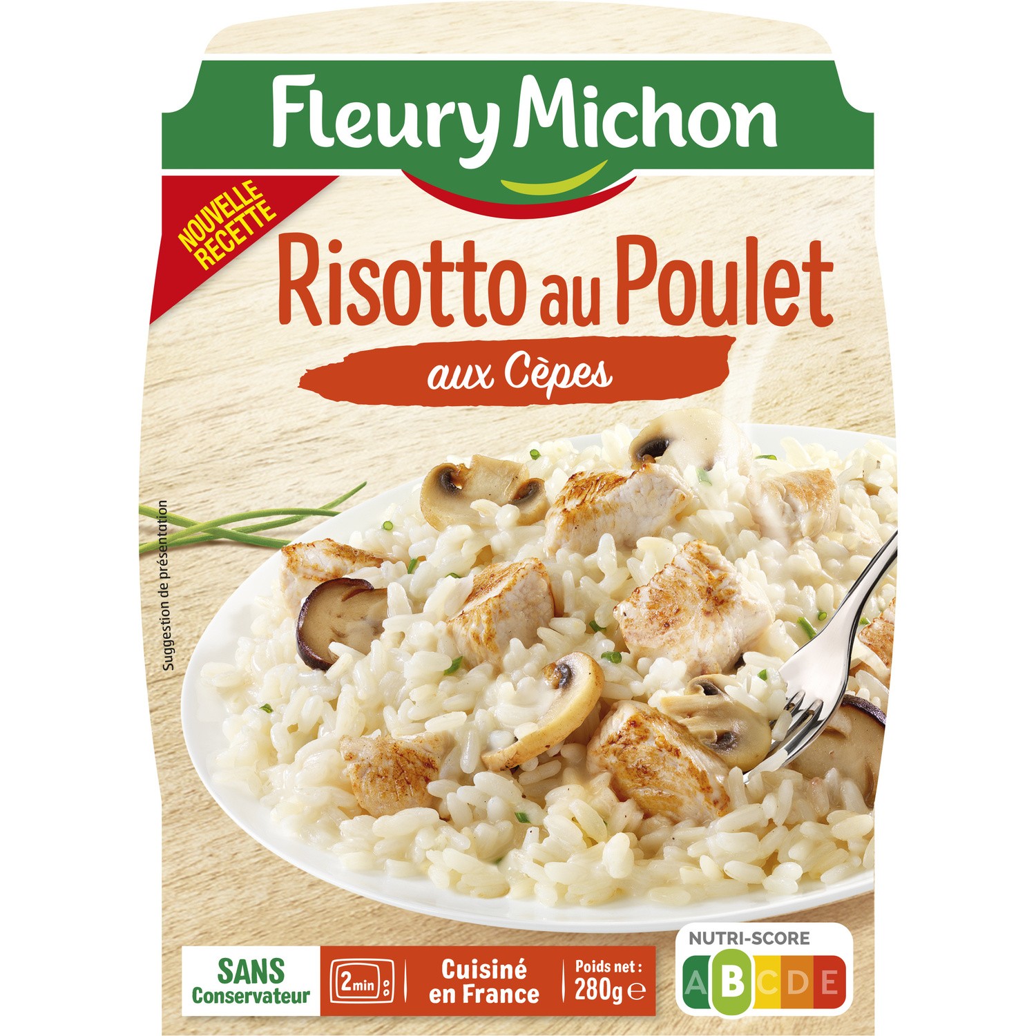 Risotto au poulet et champignons. Ingrédients : Eau, riz cuit 25%, _crème_ fraîche, poulet traité en salaison (poulet 13%, amidon de tapioca, dextrose, sel), crème de...
