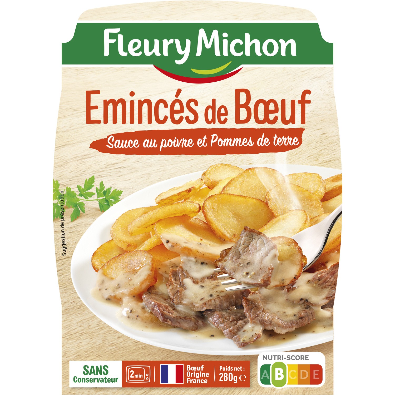 Emincés de Boeuf Sauce au poivre et Pommes de terre. Ingrédients : Pommes de terre 47%, émincés de boeuf 20% (viande de boeuf, fécule de...