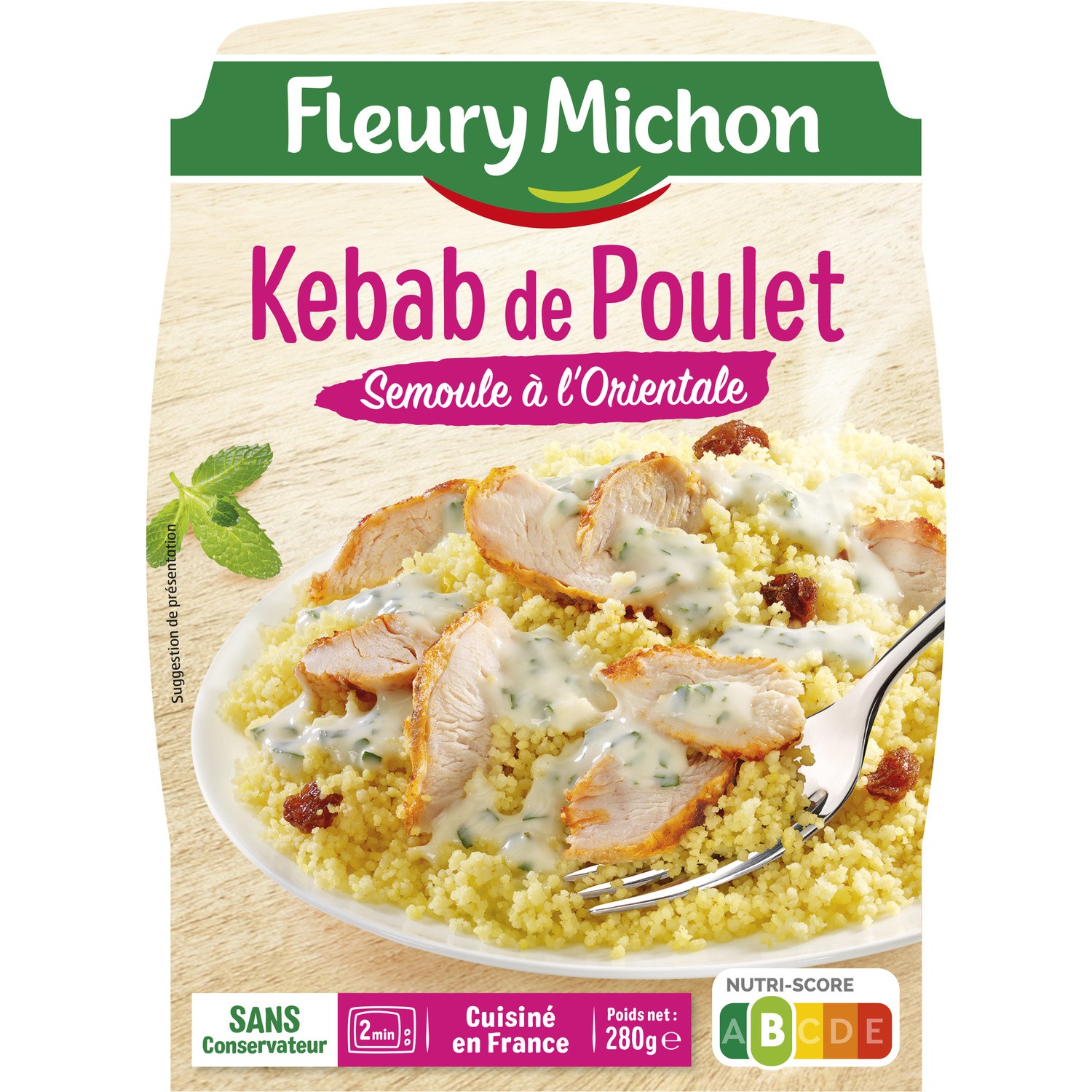 semoule, kebab de poulet, sauce au fromage blanc. Ingrédients : Semoule de _blé_ réhydratée 38%, kebab de poulet (cuisse de poulet 18.6%, dextrose, amidon de manioc,...