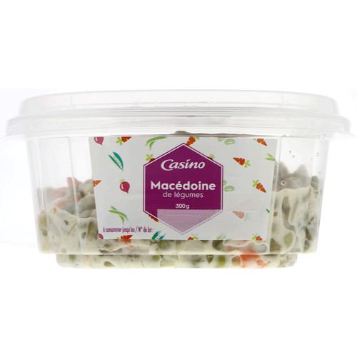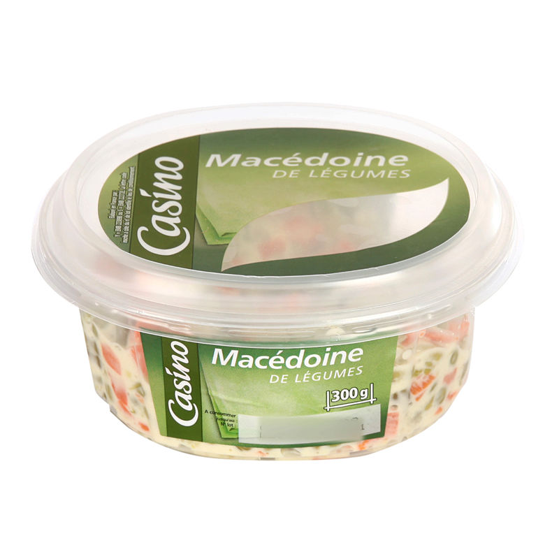 Macedoine de legumes assaisonnée. Ingrédients : macédoine de légumes 76 % (carotte cuite, haricot vert, petit pois, flageolet, pomme de terre), huile de colza, eau,...