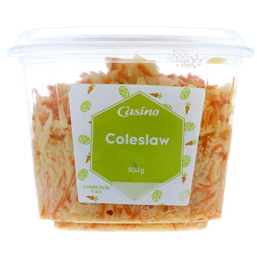 Coleslaw. Ingrédients : choux blancs (45%), carottes (29%), sauce (22%) (huile de colza, eau, moutarde de Dijon (eau, graines de moutarde, vinaigre d'alcool, sel), sucre,...