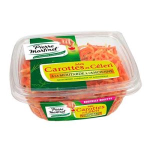 Mes carottes et céléri en méli-mélo. Ingrédients : Carotte 49 %, _céleri_ 25 %, eau, huile de colza, persil, épice, _moutarde_ à l'ancienne(eau, vinaigre d'alcool,...