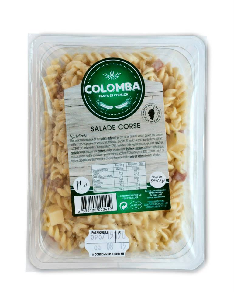 Salade Corse. Ingrédients : Pâtes torsadées (semoule de _blé_ dur, _œufs_ eau), jambon cuit en dés (13 % Jambon de porc, eau dextrose, acidifiant :...