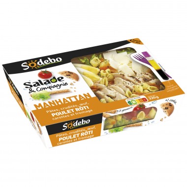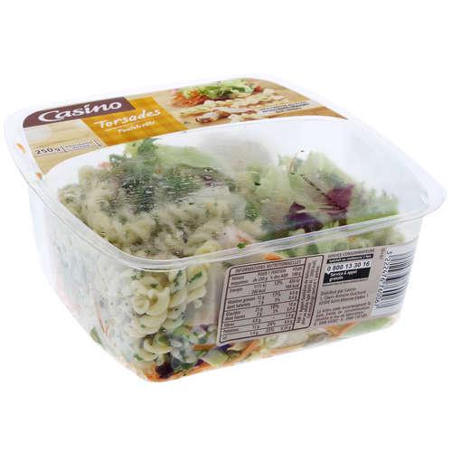 Salade composée de crudités, pâtes alimentaires cuites, émincés de filet de poulet traité en salaison - Vinaigrette allégée en matières grasses aux herbes.. Ingrédients :...