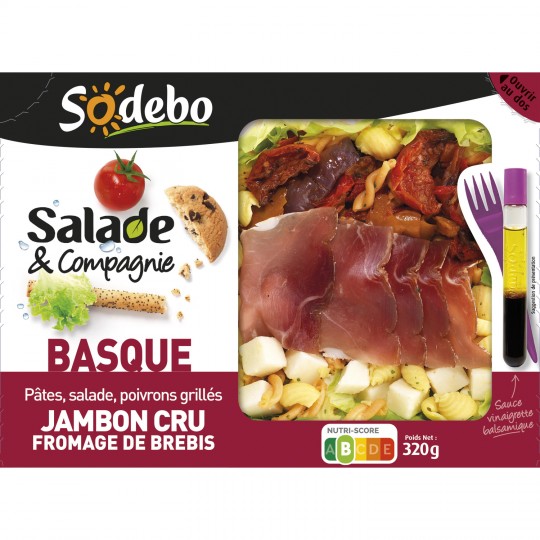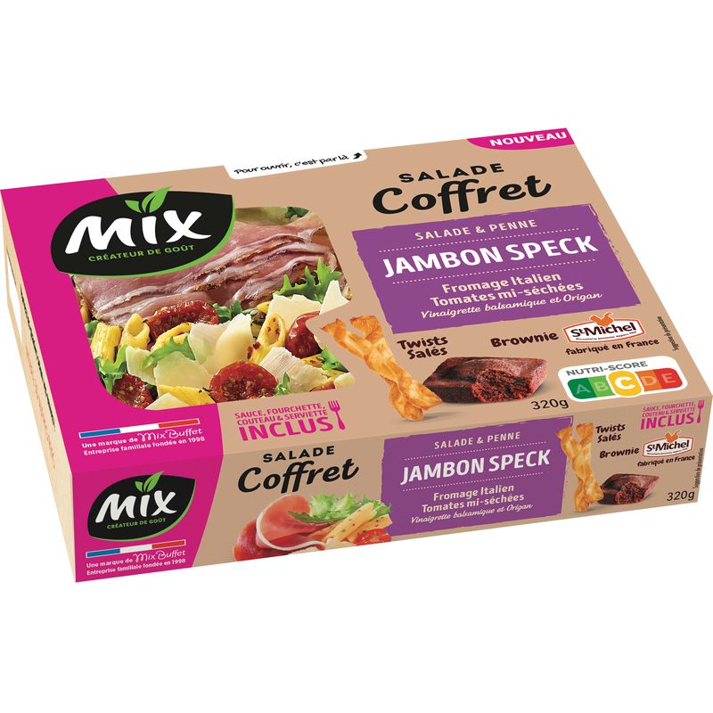 Salade Coffret Jambon Speck, 320g. Ingrédients : 176 g de Penne cuisinées (55%) : pâtes alimentaires aux _oeufs_ cuites 50,9% (eau, semoule de _blé_ dur,...
