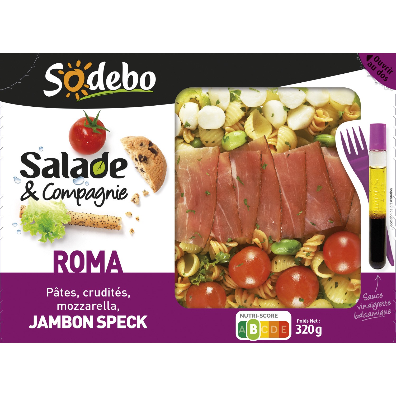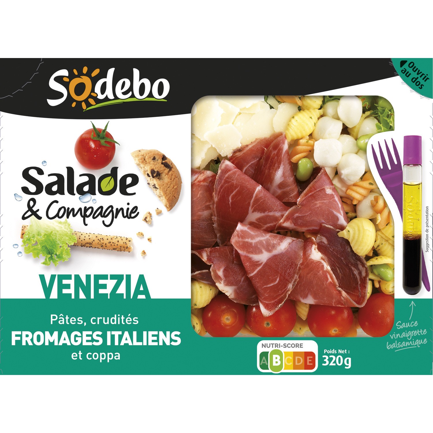 Pâtes, Fromages Italiens, Salade, Coppa et Crudités Sauce à l'huile d'olive et au vinaigre balsamique.. Ingrédients : => Conchiglie et fusilli cuits 46% (eau, semoule...