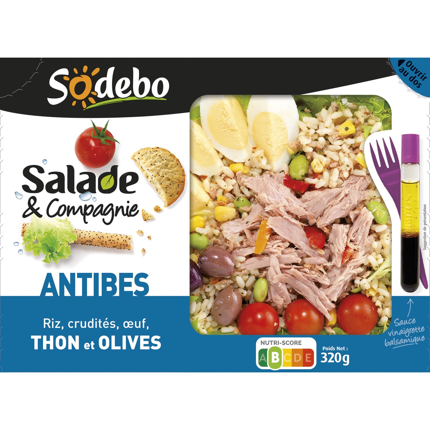salade composée (Riz, oeuf, salade, crudités, thon, olives et sauce à l'huile d'olive et au vinaigre balsamique). Ingrédients : => Riz cuit 30% (eau, riz,...