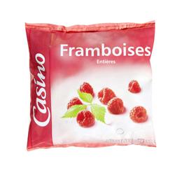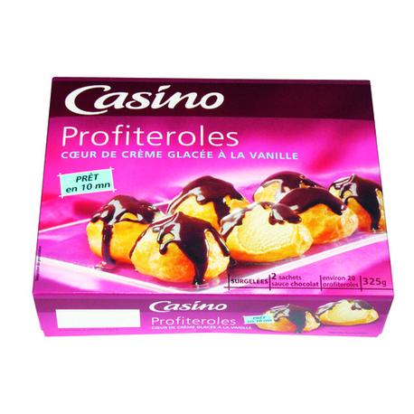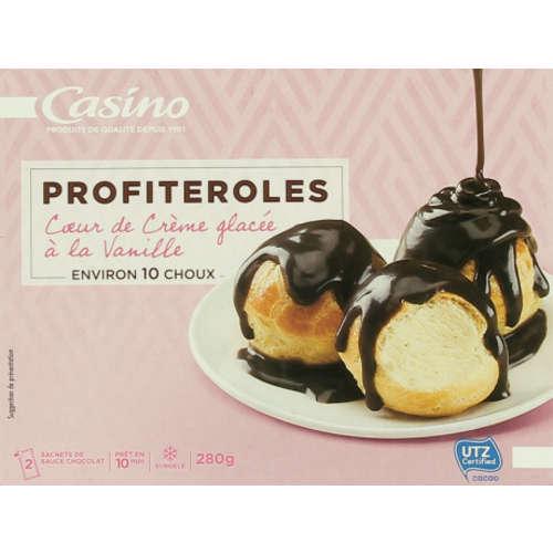 Profiteroles surgelées à la crème glacée vanille accompagnées de 2 sachets de sauce au chocolat. Ingrédients : Crème glacée à la vanille 54,8% (_lait_ écrémé...