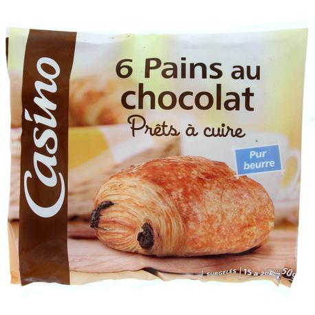 Pains au chocolat pur beurre, crus, prêts à cuire - surgelés. Ingrédients : Farine de _blé_ - _beurre_ 21% - eau - chocolat 11% (sucre...