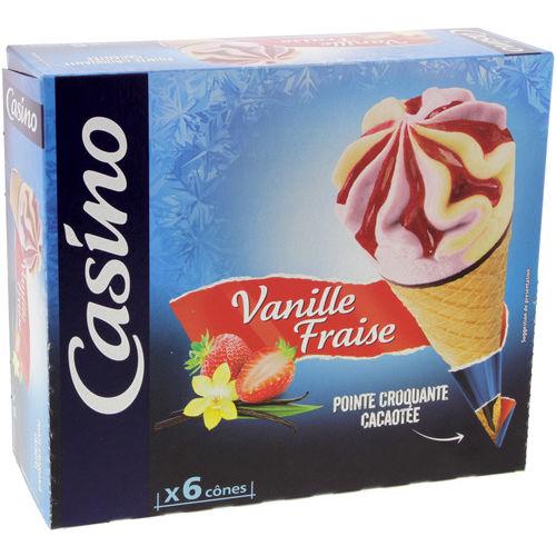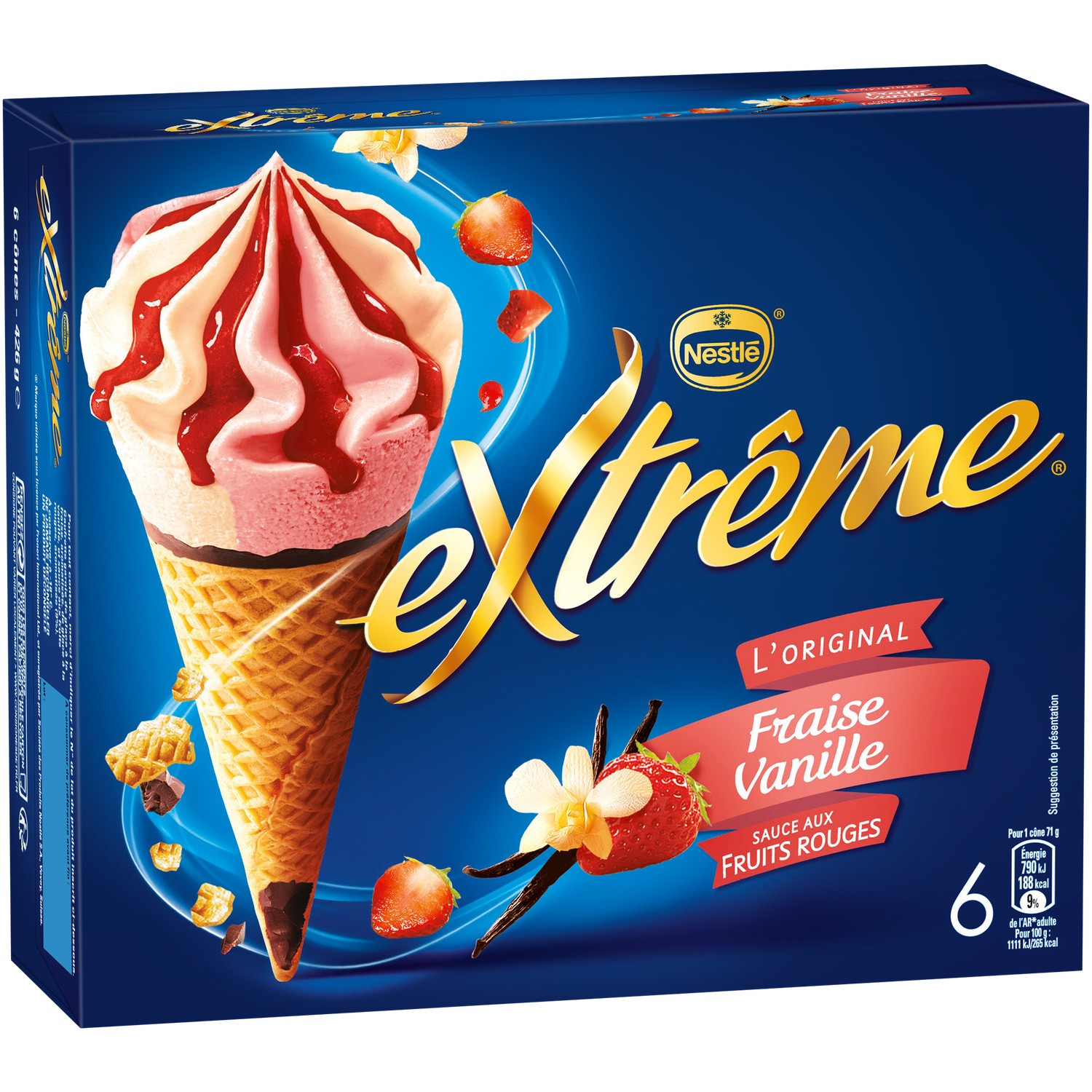 la boite de 6 cônes - 426 gIngrédientsIngrédients : Eau, sucre, purée de fraise (11%), graisses et huiles végétales (noix de coco, tournesol), LAIT écrémé...