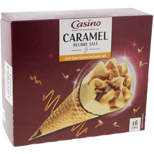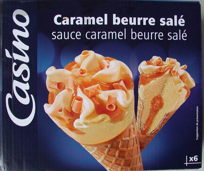 6 cônes de glace au caramel au beurre salé (65,7%) avec un crayon de sauce au caramel au beurre salé (5,6%), dans un cornet biscuit...