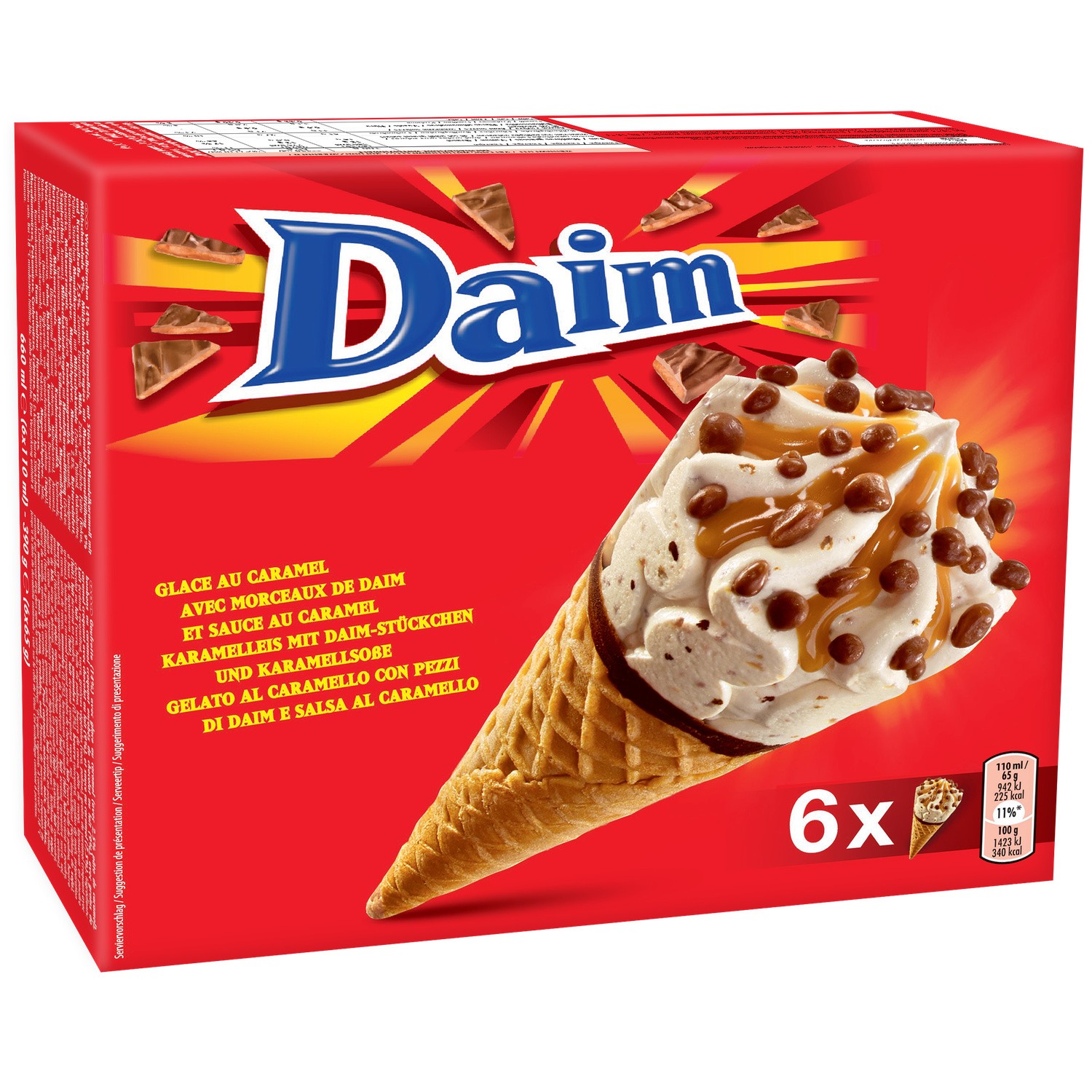 Glace Daim. Ingrédients : lait écrémé reconstitué, sucre, graisses végétales (coco, palme), grains de caramel croquant avec chocolat au lait (sucre, huile de palme, beurre...