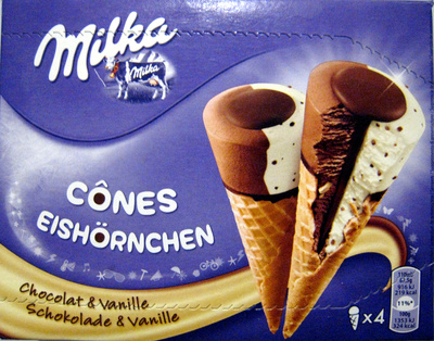 Cônes avec glace. Ingrédients : _lait_ écrémé reconstitué, chocolat au _lait_ du pays alpin (sucre, _beurre_ de cacao, pâte de cacao, poudre de _lait_ écrémé,...