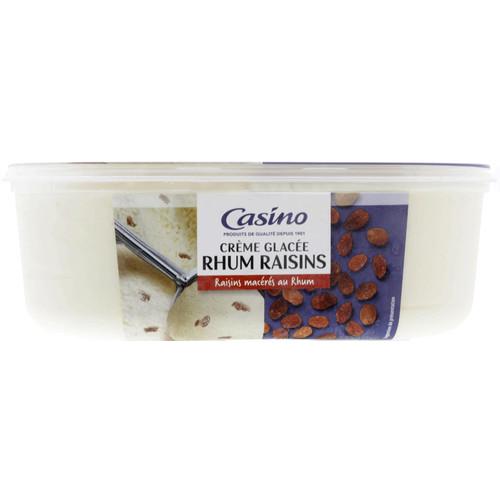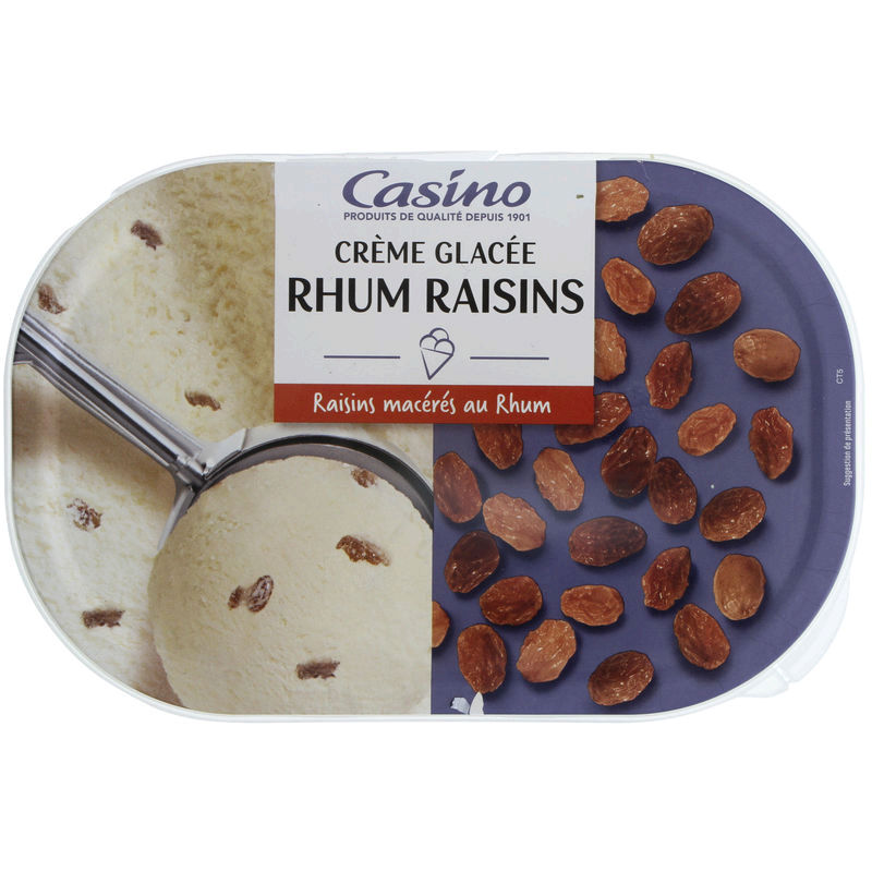 Crème glacée au rhum (89%) avec préparation de raisins macérés au rhum (11%). Ingrédients : Eau - _crème_ fraîche - sucre - _lait_ écrémé réhydraté...