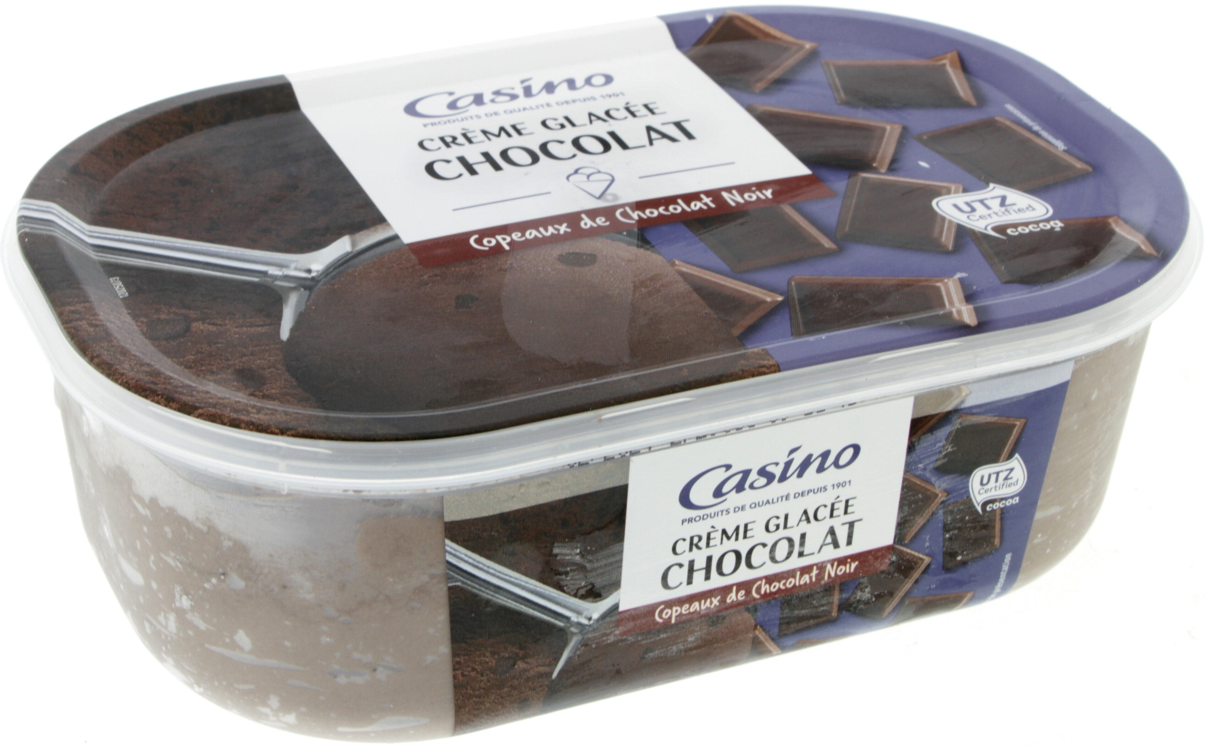 Crème glacée au chocolat noir (96%) avec copeaux de chocolat (4%). Ingrédients : _Crème_ fraîche - _lait_ écrémé réhydraté - eau - sucre - _lactose_...