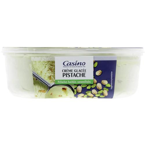 Crème glacée à la pistache (95%) avec des pistaches hachées caramélisées (5%), surgelée. Ingrédients : Eau - _lait_ écrémé réhydraté - _crème_ - sucre -...