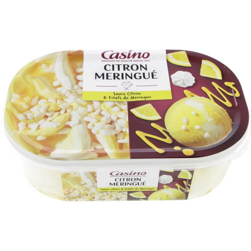 Crème glacée à la vanille (41%) et crème glacée au citron, aromatisée (41%), avec une sauce au citron (16%) en inclusions et en décor, et...