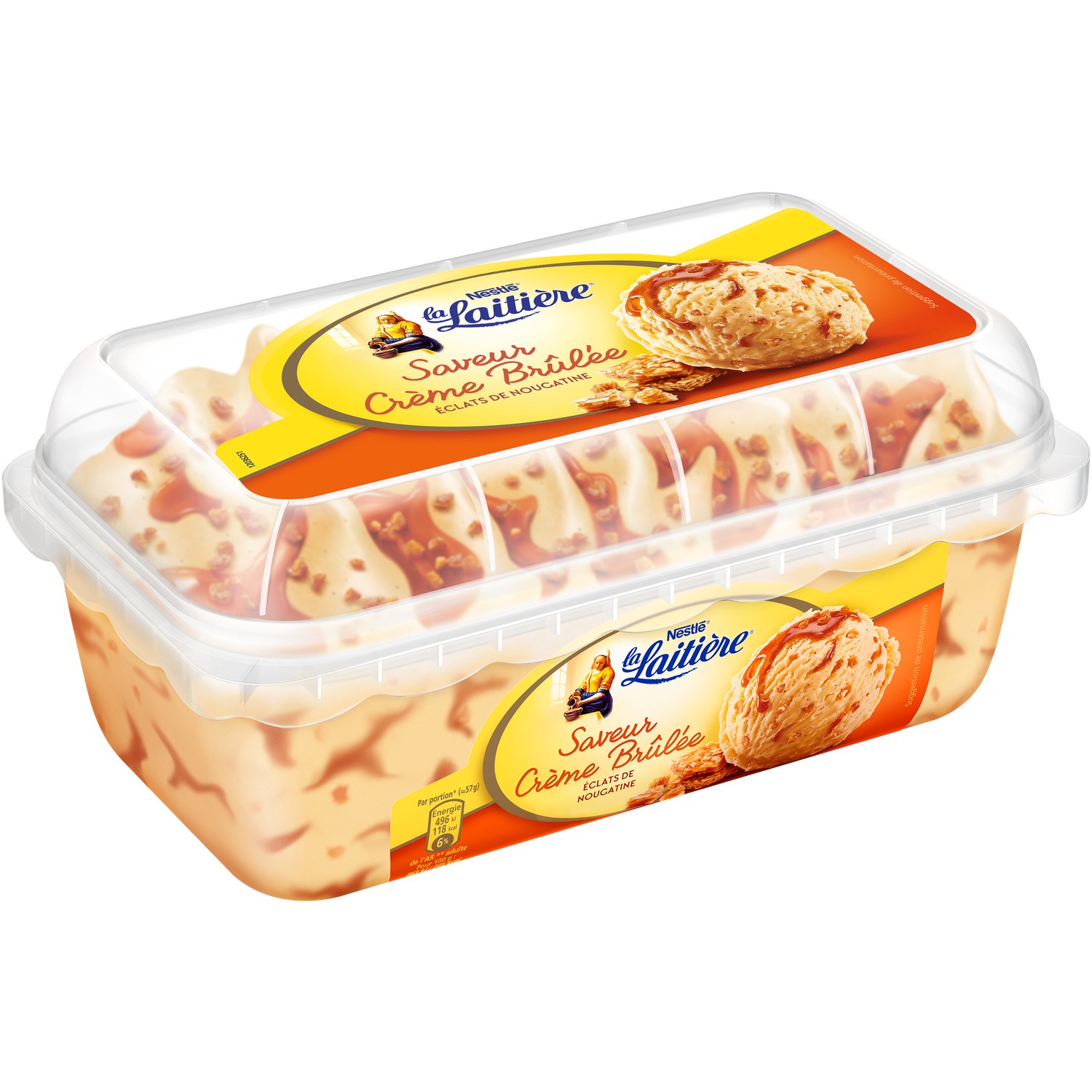 Crème glacée saveur crème brûlée, sauce caramel (12.7%), éclats de nougatine (2.9%) en inclusion, éclats de caramel (1.5%) en décor. Ingrédients : _lait_ écrémé réhydraté,...