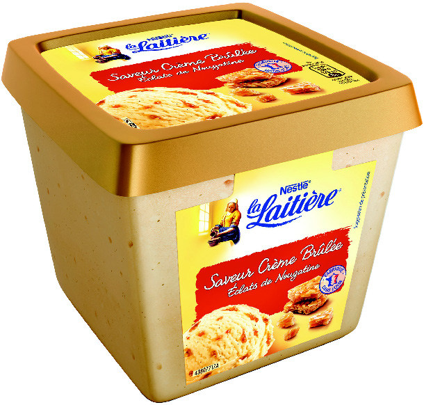 Crème glacée vanille parfum crème brûlée avec des morceaux de nougatine (6,5%) et des morceaux de sucre caramélisés (2%). Ingrédients : _lait_ écrémé, eau, _crème_,...