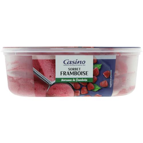 Sorbet à la framboise (90%) avec une préparation de morceaux de framboise, aromatisée (10%), surgelé. Ingrédients : Eau - purée de framboise 27% - sucre...