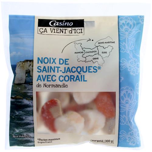 Noix de Coquilles Saint-Jacques de Normandie (Pecten maximus) avec corail - surgelées. Ingrédients : _Noix de Coquilles Saint Jacques_ (Pecten maximus) de Normandie, avec corail,...