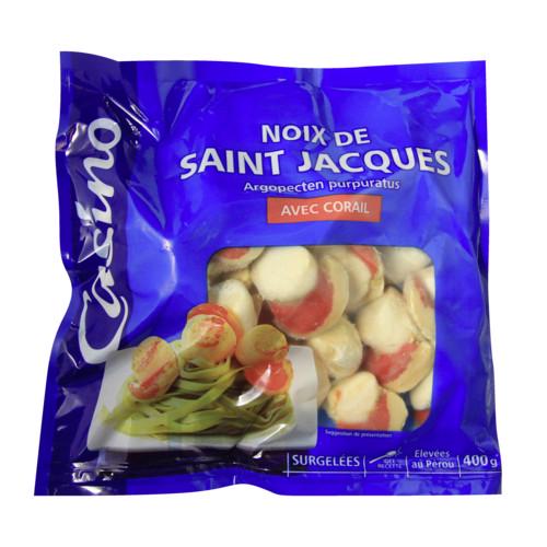 Noix de saint jacques avec corail surgelées Argopecten purpuratus élevées au Pérou. Ingrédients : 100 % Noix de saint jacques avec corail élevées au Pérou...