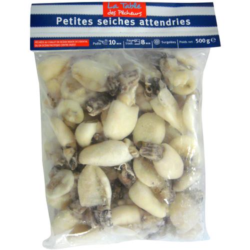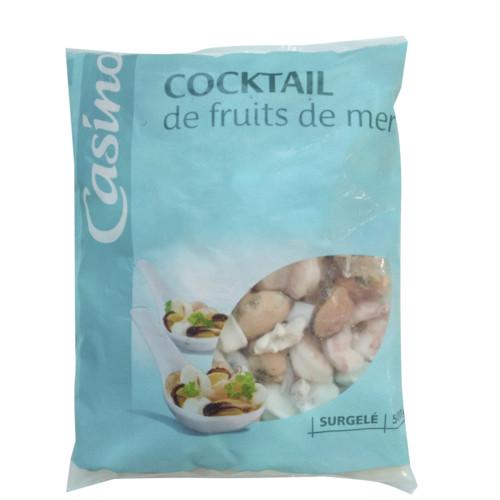 Mélange de moules du Pacifique, de crevettes, d'encornets ou encornets géant, de seiches ou calmars, surgelé. Ingrédients : Moule du pacifique décoquillée cuite 35% (mytilus...