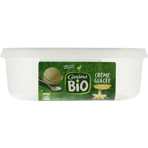 Crème glacée à la vanille de Madagascar issue de l'agriculture biologique, surgelée. Ingrédients : Eau - sucre de canne* 15,5% - _lait_ écrémé* en poudre...