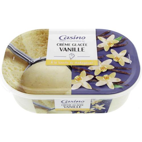 Crème glacée à la vanille de Madagascar surgelée. Ingrédients : Eau - _lait_ écrémé réhydraté - _crème_ - sucre - sirop de glucose-fructose - _lactose_...