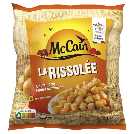 Pommes de terre rissolées, préfrites, surgelées.. Ingrédients : Pommes de terre 95%, huile de tournesol 5%. Non fabriqué à l'huile d'arachide. Sans conservateur. Quantité :...