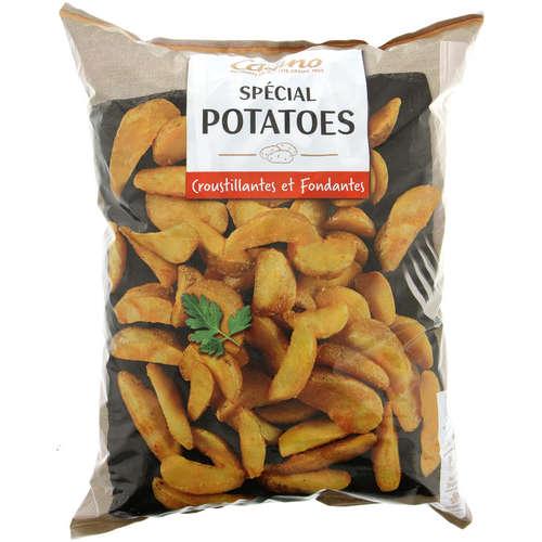 Quartiers de pommes de terre avec peau, enrobés, préfrits et surgelés. Ingrédients : Pommes de terre 88% - huile de tournesol - farine de _blé_...
