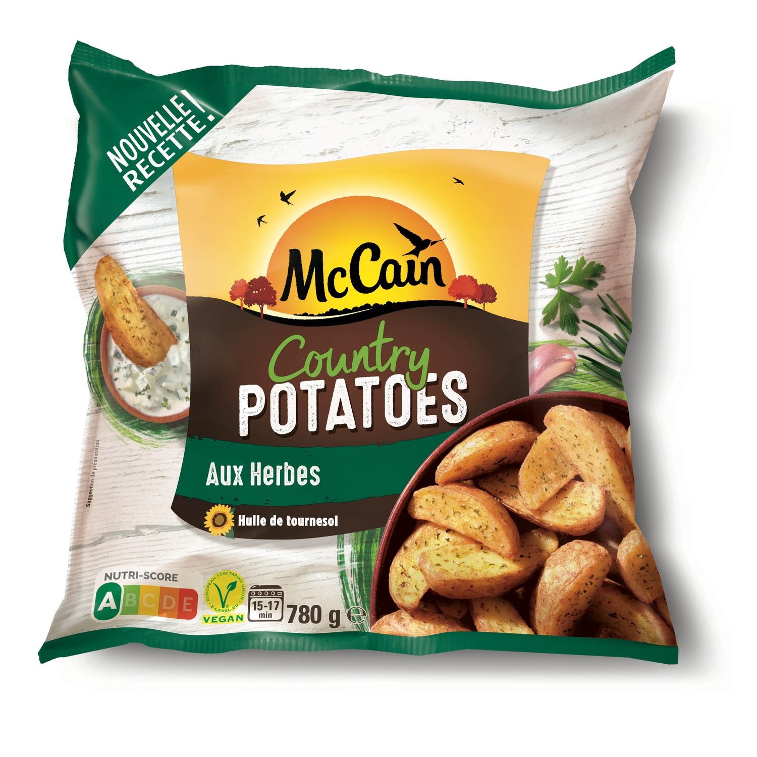 Quartier de pommes de terres au herbes prérisolées - Country Potatoes aux Herbes. Ingrédients : Pommes de terre (89 %), huile de tournesol (5,5 %),...
