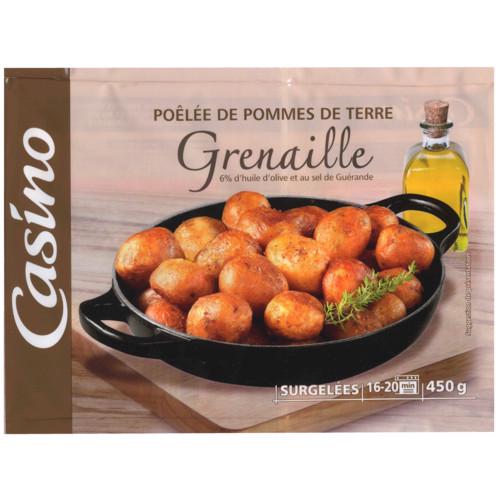 Pommes de terre Grenaille entières avec peau préfrites, enrobées à l'huile d'olive vierge extra (6%) et au sel de Guérande, surgelées. Ingrédients : Pommes de...