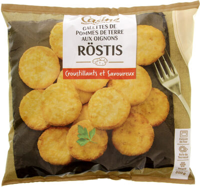 Galettes de pommes de terre râpées, surgelées. Ingrédients : Pomme de terre 94%, flocons de pommes de terre, fécule de pomme de terre, sel, stabilisant...