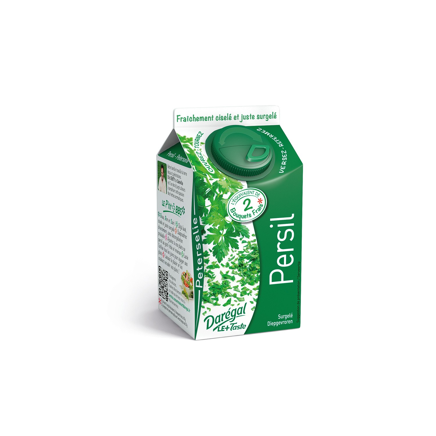 Persil ciselé surgelé. Ingrédients : Persil. huile de tournesol et de colza (5% maxi pour rester saupoudrable) Quantité : 50 g Marque : Darégal