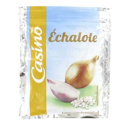 Echalote en cubes surgelée. Ingrédients : 100% échalote Quantité : 100 g Marque : Casino