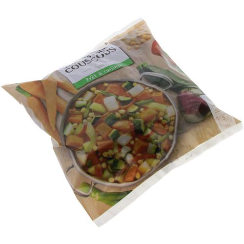 Mélange de légumes pour couscous (90%) avec galets de sauce aromatisés (10%), surgelé. Ingrédients : Carottes en cubes 21,9% - courgettes en cubes 18% -...