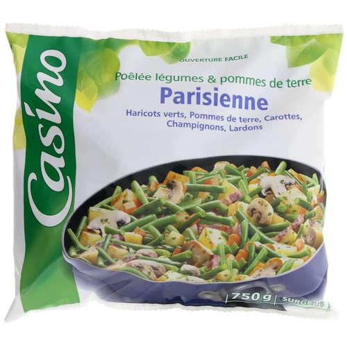 La poêlée parisienne. Ingrédients : Haricots verts 30%, pommes de terre préfrites 24% (pommes de terre 23%, huile de tournesol, dextrose), carottes 13%, champignons de...