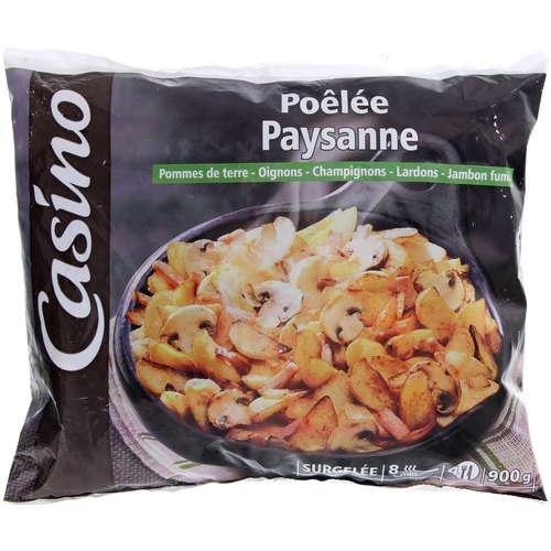 Mélange assaisonné de haricots verts coupés, de pommes de terre en cubes préfrites, de carottes, de champignons de Paris et de lardons cuits fumés, surgelé....
