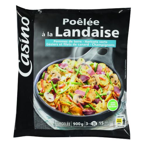 Poêlée à base de pommes de terre, haricots verts, gésiers et filets de canard, champignons, surgelée. Ingrédients : Pommes de terre préfrites 50% (pommes de...