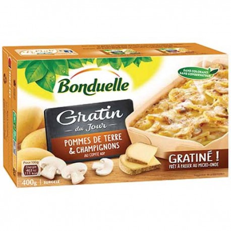 Mélange de pommes de terre et champignons cuisiné et gratiné à l'emmental surgelé. Ingrédients : Pommes de terre préfrites 46% (pommes de terre 43,5%, huile...