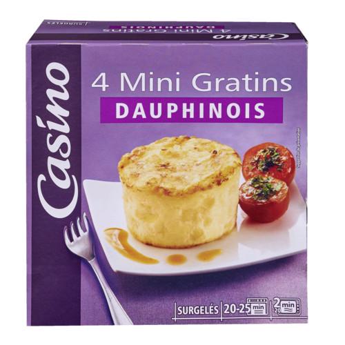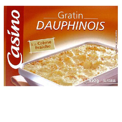 Gratin dauphinois surgelé. Ingrédients : Pommes de terre 52% - eau - _emmental_ 7,4% (_emmental_ 7,2% - amidon de pomme de terre) - _crème_ fraîche...